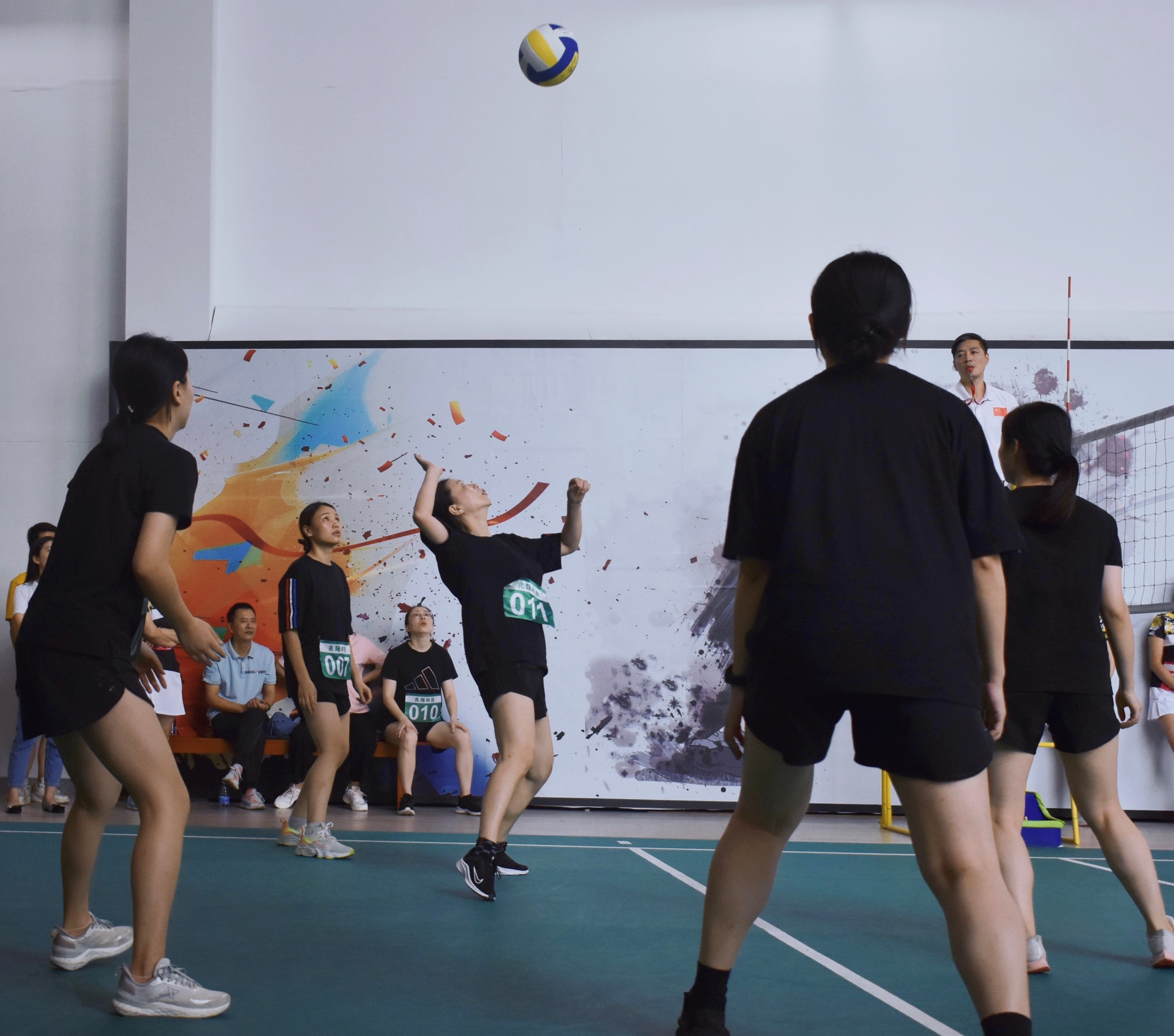 此次比赛参赛队伍共15支,其中男子组8支,女子组7支。比赛中,队员们各个精神抖擞,身姿矫健,配合默契,传球、垫球、扣球,不断组织着进攻,用心打好每一个球。迅猛的发球、巧妙的拦网、机智的轻吊、顽强的救球、精彩的对打、强力的扣杀……迎来一个又一个比赛的高潮。场外的啦啦队们也激情四溢,不断地为场上的队伍呐喊、鼓掌助威,加油声、呐喊声、助威声接连不断,场面异常热烈。摄影师们则用相机捕捉比赛中的精彩瞬间。